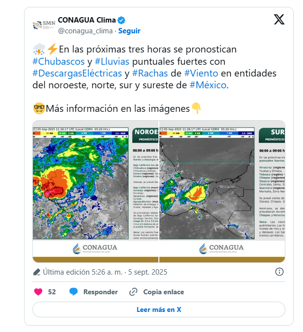 El SMN indicó que además se prevén lluvias muy fuertes (50 a 75 mm) en Baja California Sur, Chihuahua, Guerrero y Oaxaca, así como lluvias fuertes en estados del Pacífico Centro, el Valle de México y la Mesa Central.