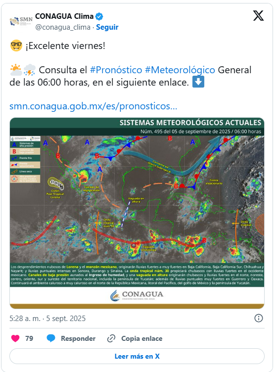 México.- El Servicio Meteorológico Nacional (SMN) alertó que este viernes persistirán condiciones de lluvias intensas en regiones del noroeste y norte de México, debido a la interacción de los desprendimientos nubosos de “Lorena” con el monzón mexicano.