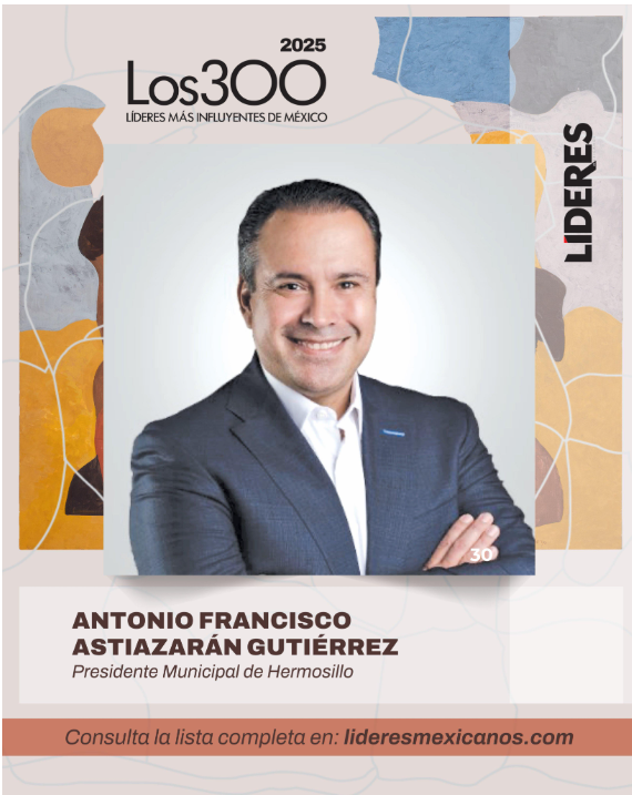 Hermosillo, Sonora; 7 de septiembre de 2025.- El presidente municipal de Hermosillo, Antonio “Toño” Astiazarán Gutiérrez, es reconocido como uno de los 300 Líderes Más Influyentes en México,en la categoría “Poder Ejecutivo”, por la revista “Líderes Mexicanos” que desde 2001 realiza esta selección de mexicanos que más impactan en nuestro país.
