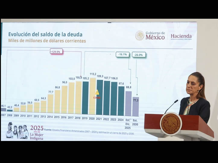 “El objetivo es que en el 2027 ya no tengamos estas cargas y vamos a seguir renegociando esta deuda para apoyar a las finanzas públicas”, dijo la presidenta, quien enfatizó que su deuda financiera se adquirió durante el sexenio de Enrique Peña Nieto, sin hacer mención que la de proveedores incrementó durante la gestión de Andrés Manuel López Obrador.
