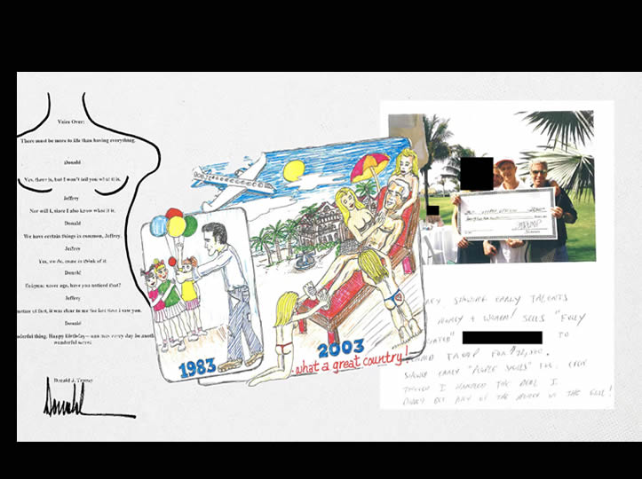 En el libro que Ghislaine Maxwell preparó en 2003 con la contribución de decenas de conocidos y familiares como regalo del 50 cumpleaños de su amigo/amante/cómplice, el pedófilo Jeffrey Epstein, hay abundantes chistes sobre la afición de este a las mujeres, cuanto más jóvenes, mejor; desnudos femeninos; fotos comprometedoras y fórmulas matemáticas; imágenes de leones y cebras copulando; el certificado de nacimiento del homenajeado y un dibujo sin firmar con una sola explicación posible: su autor tenía que estar al tanto de los crímenes de Epstein. A la izquierda, se ve a unas niñas a las que agasaja con unos globos. A la derecha, unas jóvenes que podrían ser menores le dan un masaje con los pechos al descubierto. Debajo, pone: “¡Qué gran país!“.
