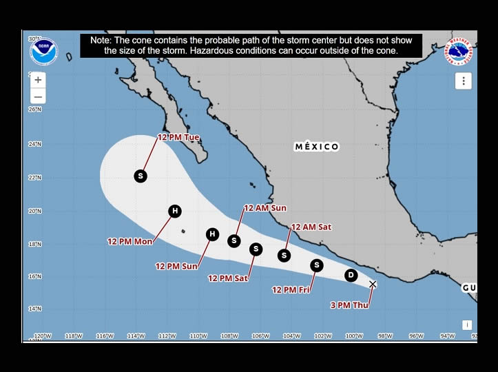 De acuerdo a la última actualización de los modelos de trayectoria, se espera que este sistema tienda a desplazarse paralelo a las costas del sur del país y se aproxime a la península de Baja California Sur.