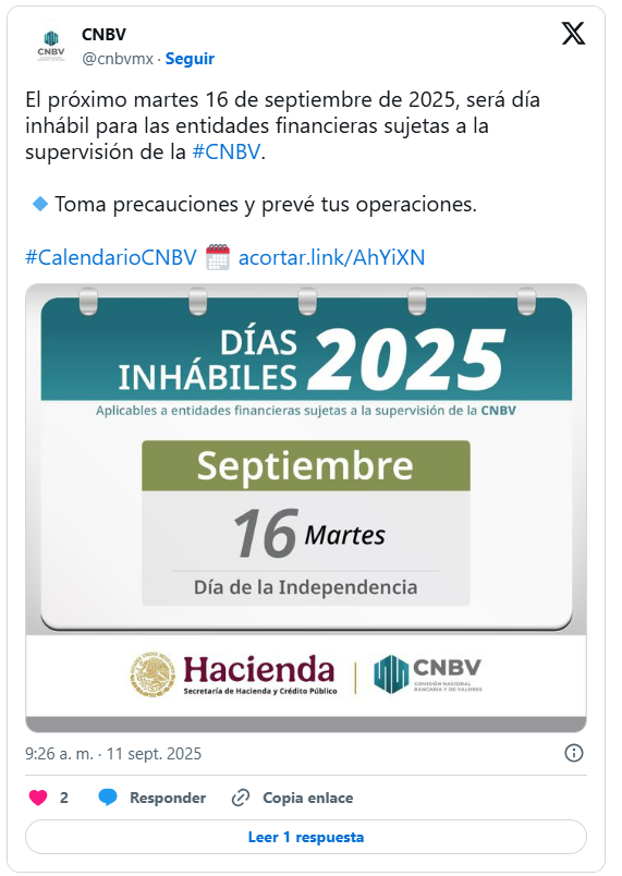 De igual forma, las sucursales bancarias operarán con normalidad, siendo el 16 de septiembre el único día inhábil por lo que no abrirán sus sucursales, informó la Comisión Nacional Bancaria y de Valores.
