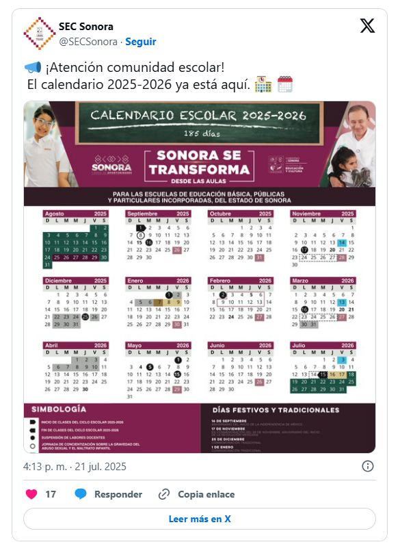 De acuerdo al calendario de la SEC en Sonora estos días son inhábiles este ciclo escolar, ¿Incluye el 15 y 16 de septiembre?