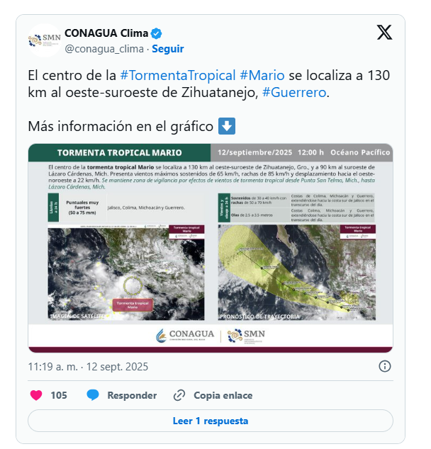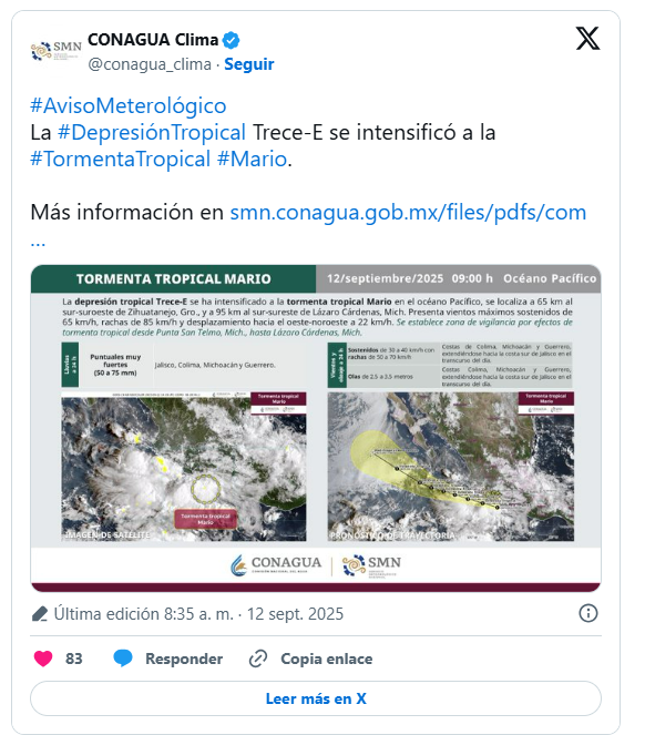 “Hoy a las 8:00 de la mañana ya subió a tormenta tropical, y ya tuvo el nombre de Mario, así que es la tormenta tropical Mario, está frente a las costas de Guerrero, está bastante retirado de Sonora, parece ser que la trayectoria no le va a favorecer al estado, se va a alejando del territorio nacional, aunque va a intentar costear, pero igual se va a ir alejando”.