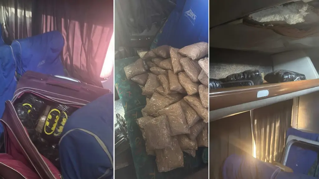 Durante la inspección, se descubrieron compartimentos ocultos en las paredes del autobús, en cuyo interior fueron localizados aproximadamente 70 paquetes con una sustancia granulada similar a la droga conocida como cristal, así como 12 paquetes con hierba seca con características propias de la mariguana