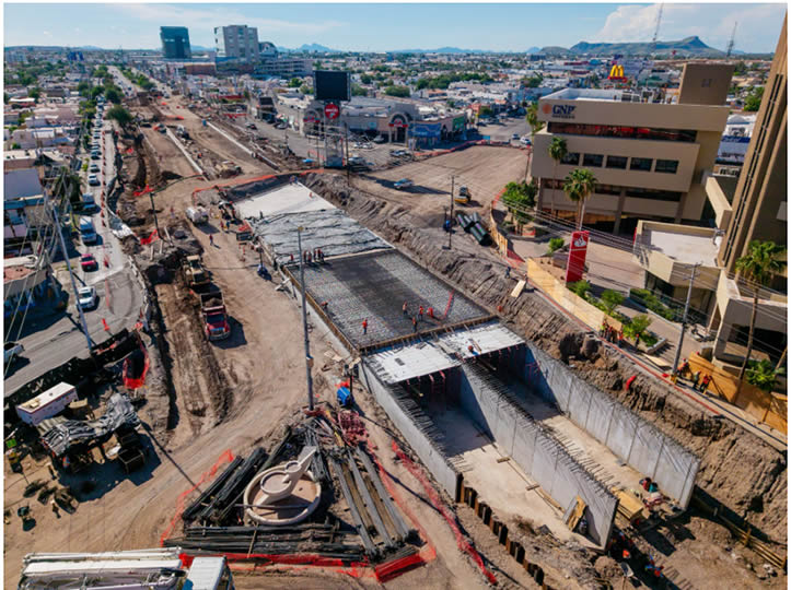 La obra que tiene una inversión de 412.5 millones de pesos de recursos municipales; cuenta con avances en rubros como el colector sanitario (100%), la parrilla pluvial (99.4%), agua potable definitiva (76.9%) y la obra civil del cruce a desnivel mayor (53.5%).