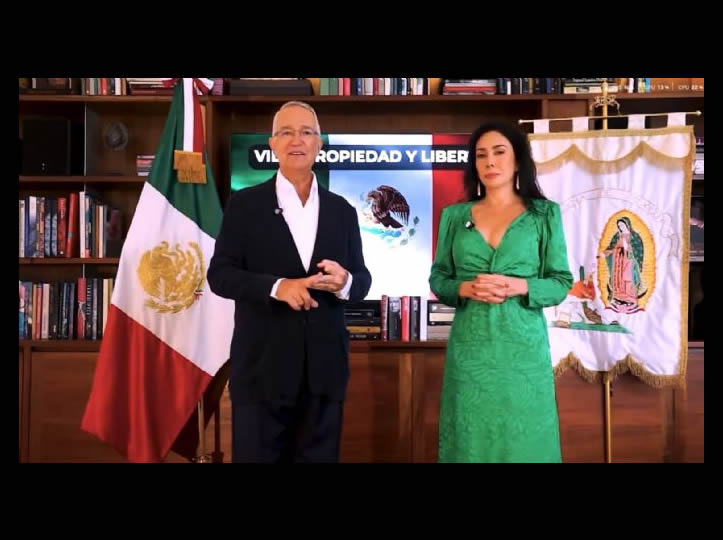 Viendo a la cámara de frente, flanqueado de su esposa María Laura Medina de Salinas y con una bandera de México, otra de la Virgen de Guadalupe y una pantalla de televisión con el lema “Vida, propiedad y libertad” atrás, el dueño de TV Azteca exhortó a los mexicanos a “definirse” entre dos campos: el del “comunismo” –es decir, del gobierno y de Morena– que arrojaría a México hacia un destino de “miseria” como en Venezuela o en Cuba; o el suyo, el lado de la “innovación, la competencia, la mejora continua” y la “prosperidad”.