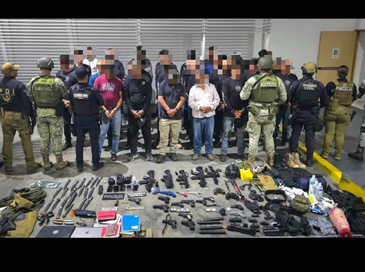 En el operativo, autoridades locales y federales decomisaron armas blancas, 19 réplicas de armas de fuego, equipo táctico y simuladores de explosivos. Entre los detenidos se encuentran hombres de diferentes estados del país, incluidos Jalisco, Nayarit, Guerrero y Estado de México, así como un ciudadano estadounidense.