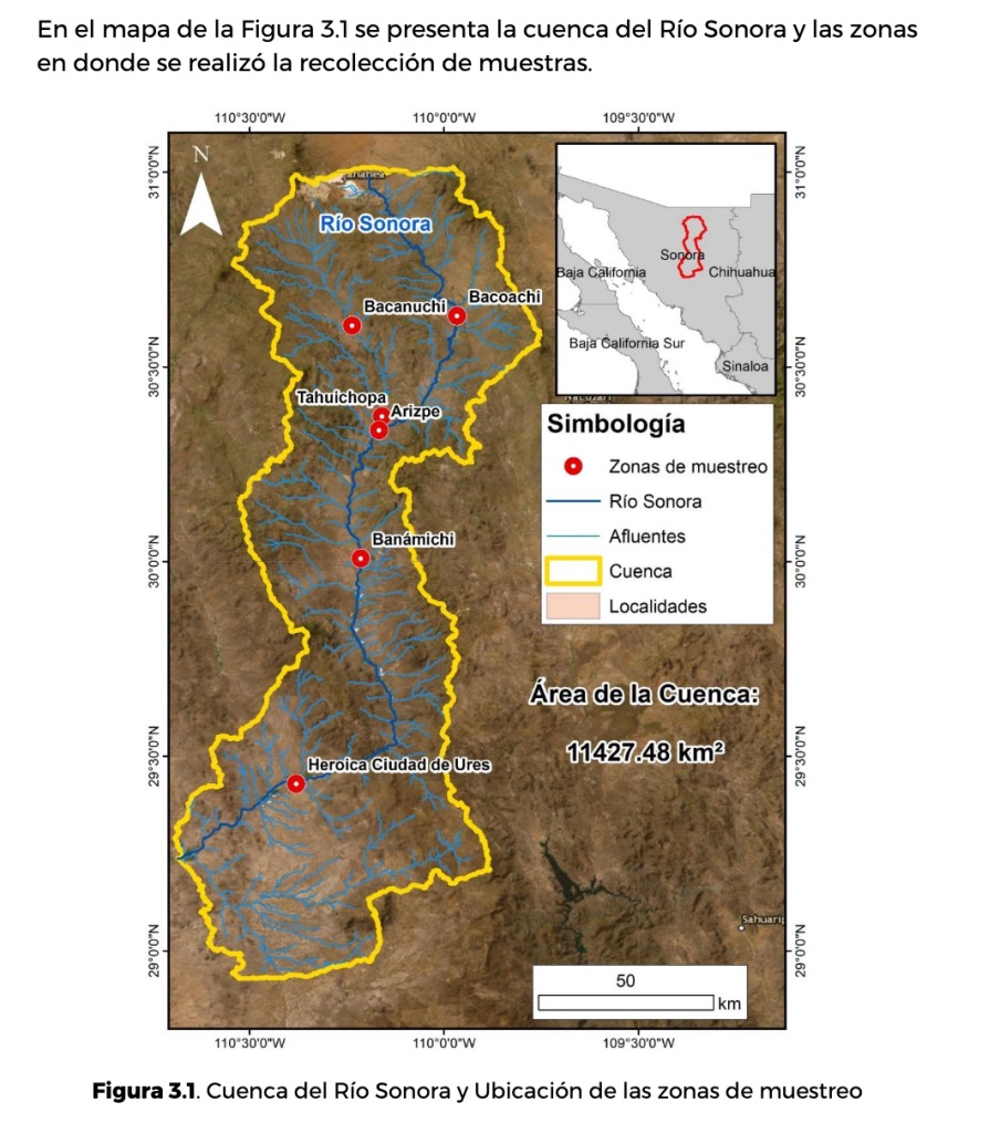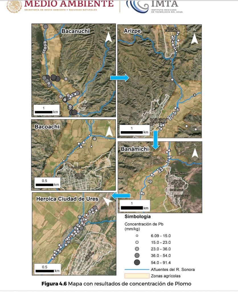 El suelo y sedimento sobre el cauce principal del río Sonora, así como los suelos en las márgenes y planicies de la Cuenca –que abarca también afluentes como el Bacanuchi– presentan altas concentraciones de cinco metales pesados (arsénico, cobre, manganeso, níquel y plomo); y concentraciones medias de otros dos (hierro y zinc), indica el Análisis de dispersión de metales pesados en la cuenca del río sonora. El documento técnico elaborado por el Instituto Mexicano de Tecnología del Agua, el INECC y el ITSON refiere que las zonas afectadas son Bacanuchi, Arizpe, Banámichi y Ures.