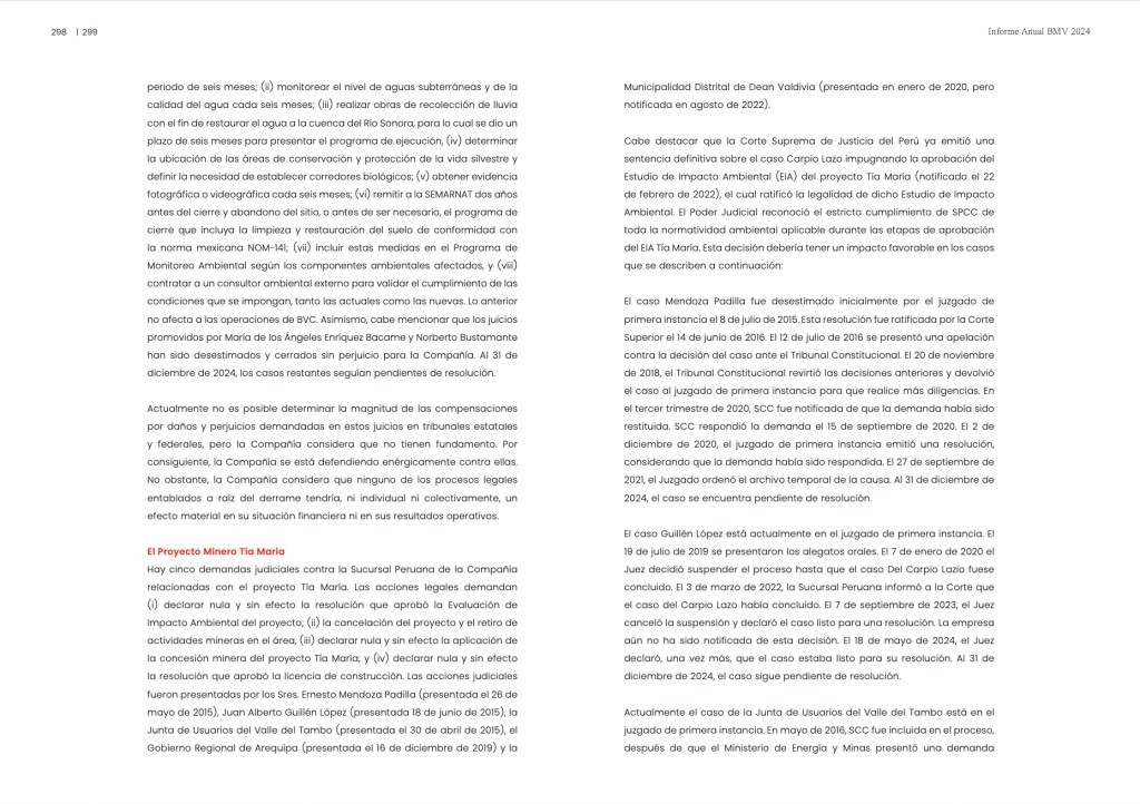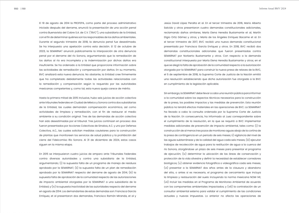 En su Informe anual 2024 –ante la BMV–, Grupo México desestimó riesgos para sus inversionistas, por el tema de la remediación del río y el pago de indemnizaciones a los afectados. En ese reporte se lee: “el 19 de agosto de 2014 la Profepa, como parte del proceso administrativo iniciado después del derrame, anunció la presentación de una acción penal contra Buenavista del Cobre, SA de CV, una subsidiaria de la Entidad, con el fin de determinar quiénes son los responsables de los daños ambientales. Durante el segundo trimestre de 2018, la denuncia penal fue desestimada. Se ha interpuesto una apelación contra esta decisión. El 12 de octubre de 2023, la Semarnat anunció públicamente la interposición de otra denuncia penal por el derrame del río Sonora, argumentando que la remediación de los daños al río era incompleta y la indemnización por dichos daños era insuficiente. Se ha ordenado a la Entidad [Grupo México] que proporcione información sobre las actividades de remediación y compensación por daños. En su momento, BVC analizará esta nueva denuncia. No obstante, la Entidad cree firmemente que ha completado debidamente todas las actividades relacionadas con la remediación y compensación según lo requerido por las autoridades mexicanas competentes y, como tal, esta nueva queja carece de mérito”.