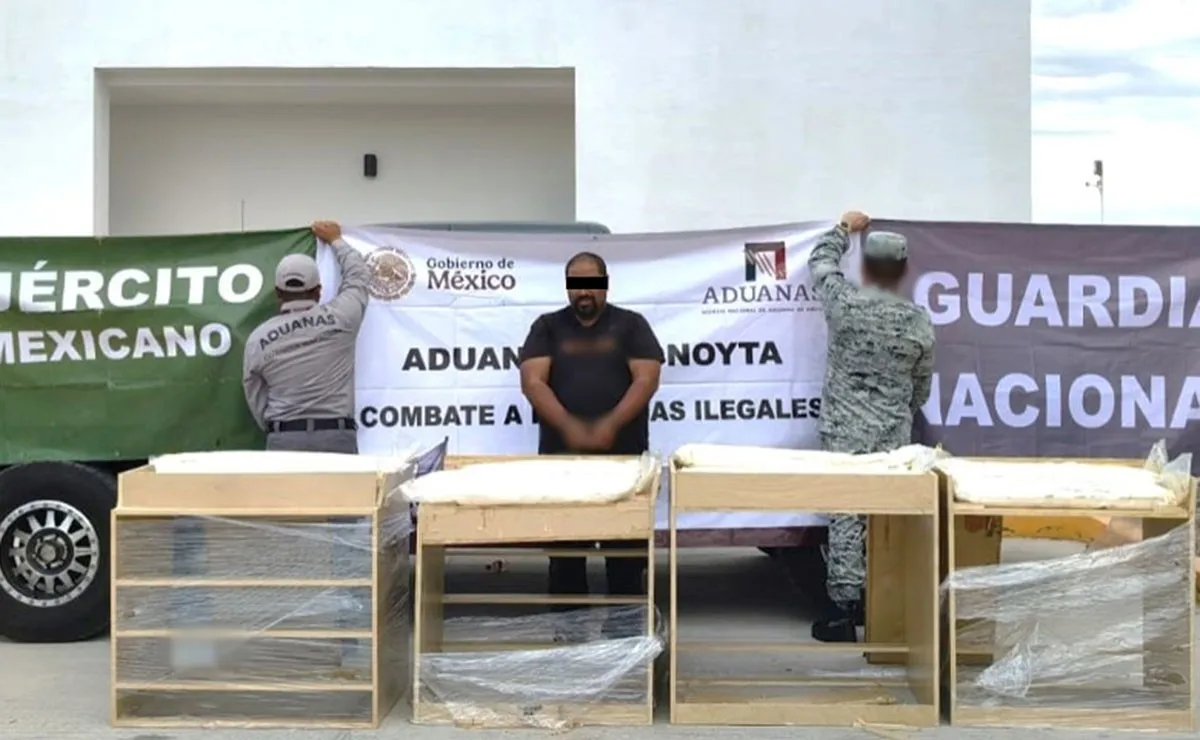 En cumplimiento de la Estrategia Nacional de Seguridad del Gobierno de México, en Sonora, integrantes de la Guardia Nacional, detuvieron a un extranjero en posesión de 80 kilogramos de metanfetamina, oculta en muebles de madera para oficina.