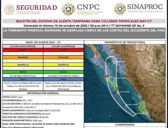 Ya como depresión tropical, Raymond continuará provocando tormentas torrenciales de hasta 250 milímetros de agua por hora, principalmente en el estado de Sonora para el domingo 12 de octubre de 2025, de acuerdo con Fabián Romaña, coordinador general del Servicio Meteorológico Nacional.