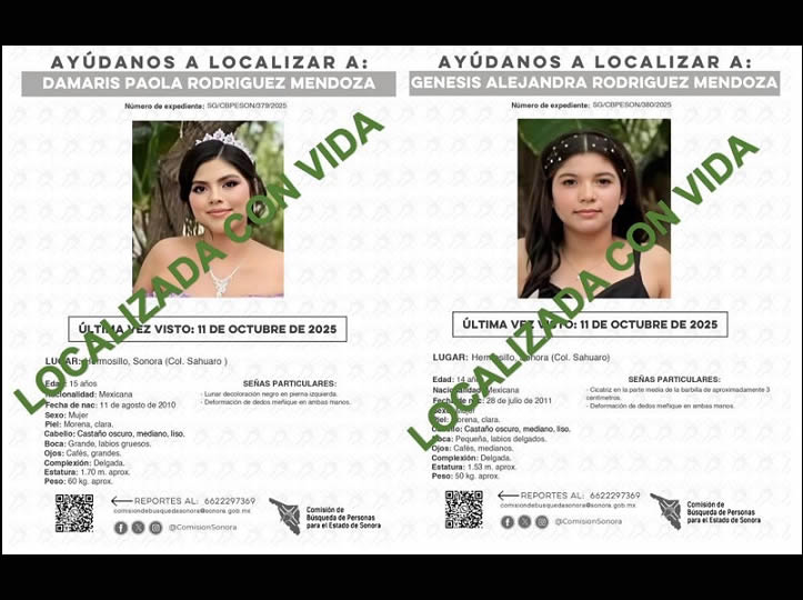 Hermosillo, Sonora.- Las hermanas Damaris Paola “N”, de 15 años, y Génesis Alejandra “N”, de 14 años, quienes tenían reporte de desaparecidas desde el pasado sábado 11 de octubre en Hermosillo fueron localizadas sanas y salvas.
