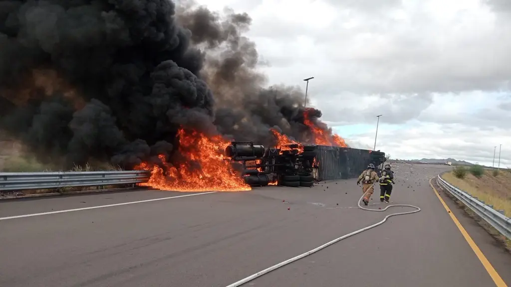 Un trailer se incendió en llamas al volcarse cuando trataba de incorporarse a la carretera internacional desde el libramiento de Hermosillo, Sonora.