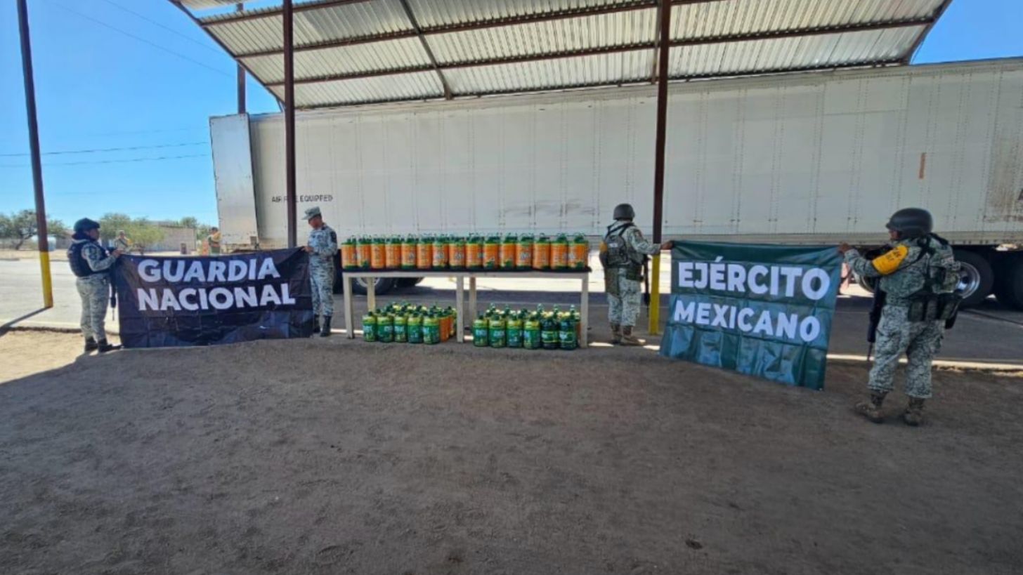 Como resultado de la aplicación de los procedimientos de revisión en coordinación con la Guardia Nacional, personal del Ejército Mexicano aseguró un cargamento de metanfetamina líquida en el Puesto Militar de Seguridad Regional “Estación Doctor”, ubicado en este municipio.