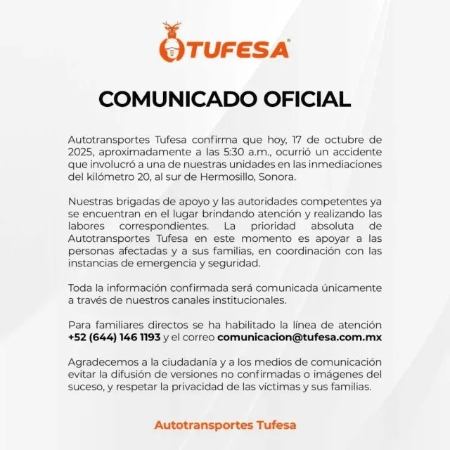 La compañía restringió comentarios en redes sociales “por respeto a las víctimas” e instó a los usuarios a consultar únicamente fuentes oficiales del Gobierno de Sonora y de Tufesa mientras concluyen los peritajes.