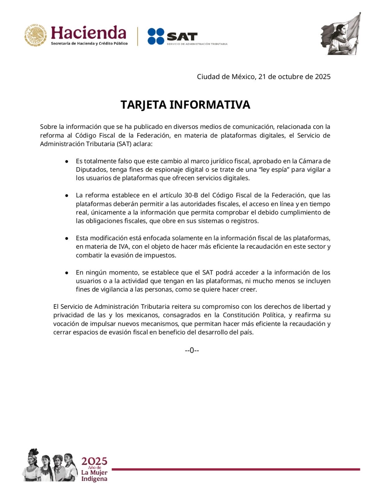 El Servicio de Administración Tributaria (SAT) afirmó que es totalmente falso que se esté aprobando una “Ley Espía” en el Congreso para obtener información de las empresas tecnológicas.