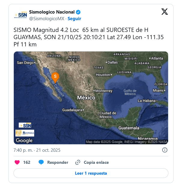 El Servicio Sismológico Nacional alertó el martes, 21 de octubre, sobre un sismo de magnitud 4.2 a 65 kilómetros de la ciudad de Guaymas, Sonora.
