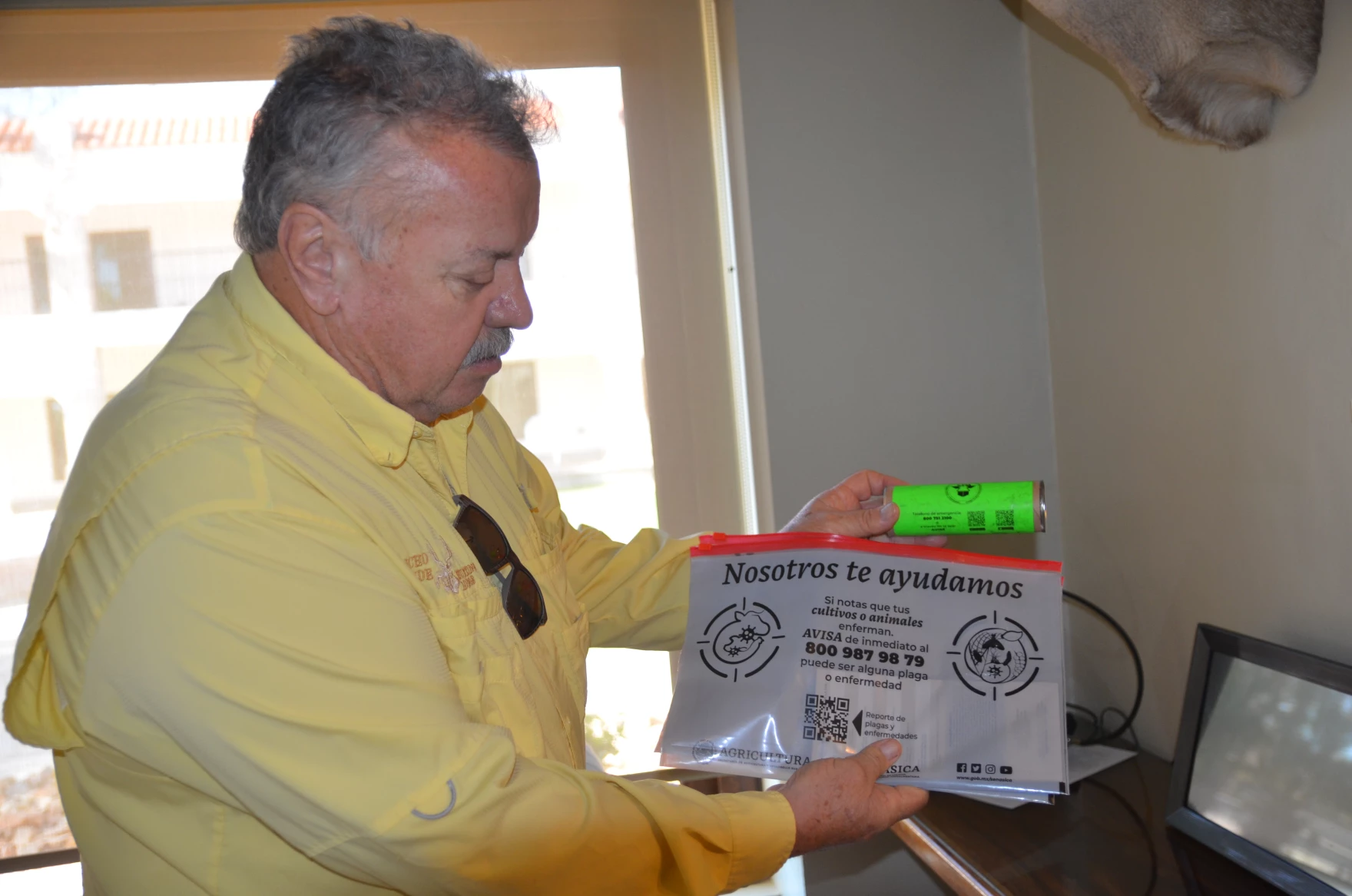 Mientras se dirige a la alimentación matutina del ganado, Fimbres muestra una nueva herramienta en su rancho de más de 7,000 acres, una que su padre y su abuelo no tenían en sus alforjas cuando cruzaron su ganado a través de este mismo desierto. Es una bolsa de plástico y un bote, para enviar cualquier gusano que pueda encontrar en su manada a las autoridades que monitorean el camino del gusano barrenador.
