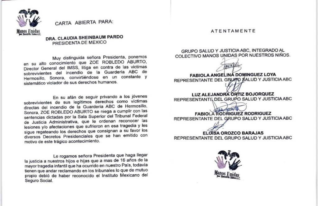 “Le rogamos señora Presidenta que haga llegar la justicia a nuestros hijos e hijas que a más de 16 años de la mayor tragedia infantil que ha ocurrido en nuestro país, todavía tienen que andar reclamando en los tribunales lo que de mutuo propio debió haber reconocido el Instituto Mexicano del Seguro Social”, se lee en el documento.