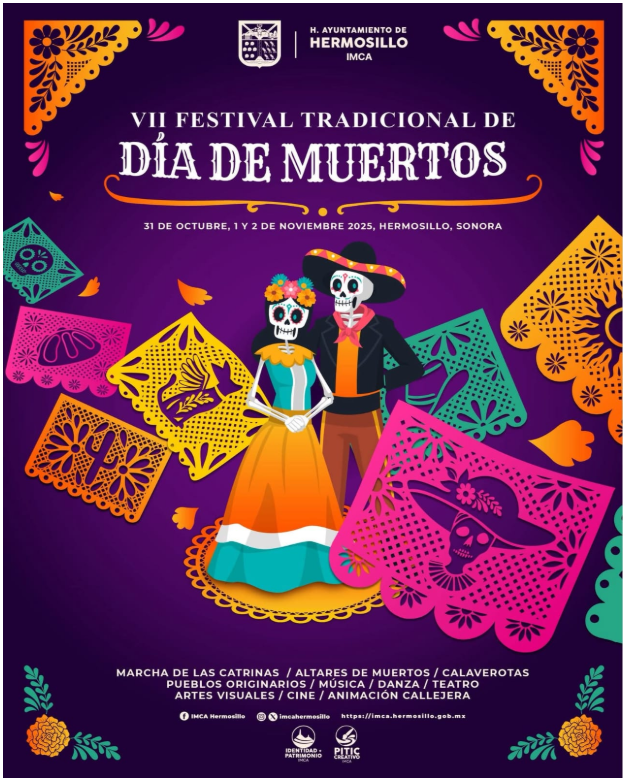 Hermosillo, Sonora; 29 de octubre, 2025.- Del 31 de octubre al 2 de noviembre próximos, hermosillenses y visitantes podrán disfrutar la variedad de actividades que el Ayuntamiento de Hermosillo, a través del Instituto Municipal de Cultura y Arte (IMCA) y la comunidad prepararon para honrar las tradiciones mexicanas del Día de Muertos, anunció Marianna González Gastélum, directora de la dependencia.
