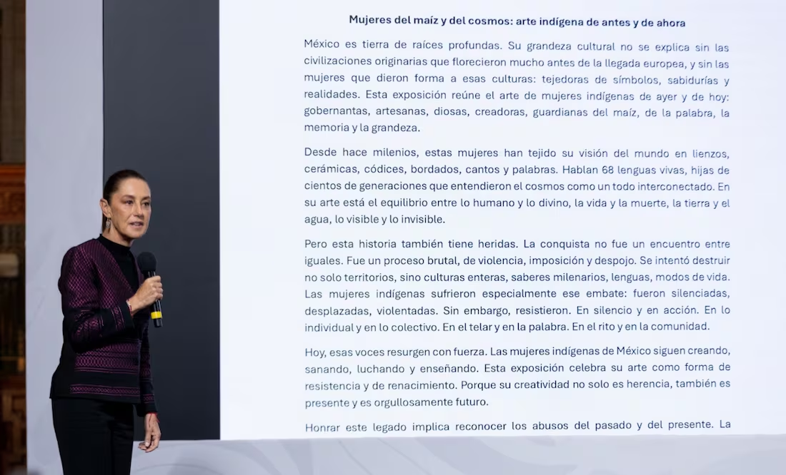 En Palacio Nacional, la titular del Ejecutivo federal recordó la solicitud de perdón que hizo López Obrador por La Conquista y anunció un libro como parte de esta exposición, del que ella escribió el prólogo.