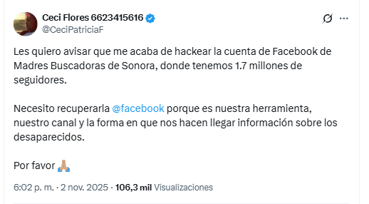 La líder del colectivo Madres Buscadoras de Sonora, Ceci Flores, denunció a través de su cuenta oficial de X (antes Twitter), que la página oficial del grupo de Facebook fue hackeada.