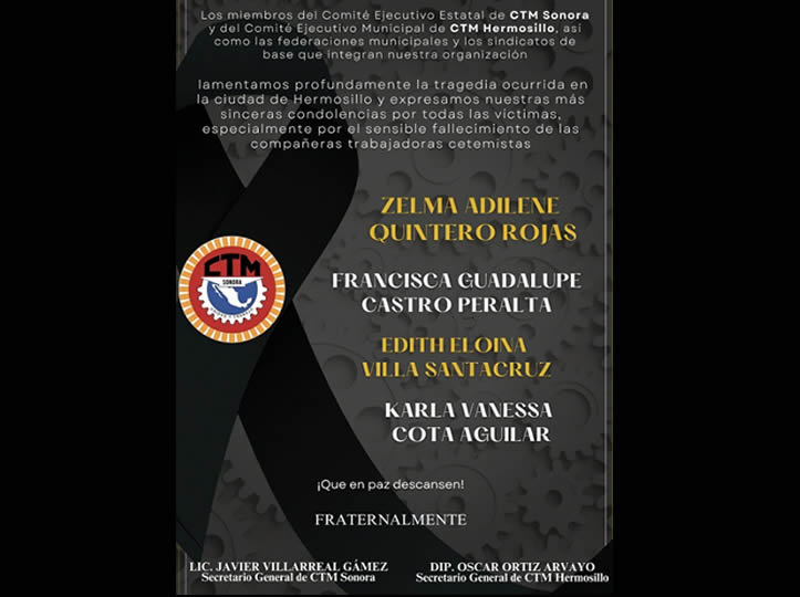 Hermosillo, Sonora.- Cuatro mujeres cetemistas afiliadas a sindicatos de la CTM fallecieron en la explosión e incendio del centro comercial Waldo y se exige justicia, dos de ellas junto a sus hijos.