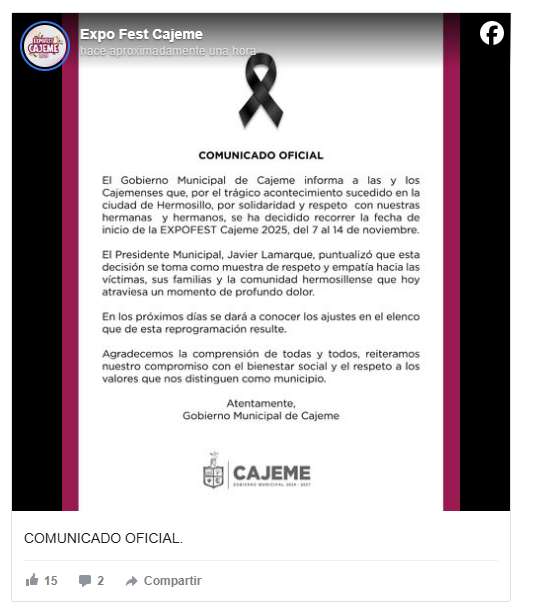 Debido al incendio y explosión de la tienda en el centro de Hermosillo, la Expo Fest Cajeme 2025, se llevará a cabo del 7 al 14 de noviembre, como acto de luto a las víctimas, informó el gobierno de la ciudad.