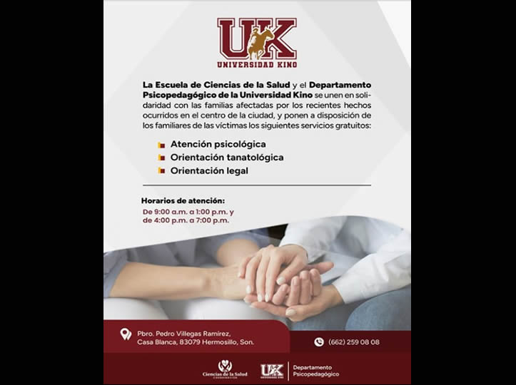 Hermosillo, Sonora.- La Escuelas de Ciencias de la Salud y el Departamento Psicopedagógico de la Universidad Kino informó que han puesto a disposición de los familiares de las víctimas del incendio de Waldos los servicios para su atención de manera gratuita