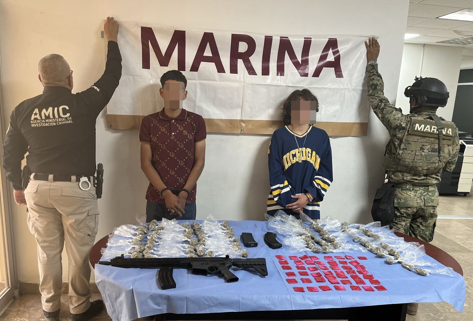 En una segunda acción, en el municipio de Cajeme, personal naval, en coadyuvancia con la AMIC y Policía Estatal, durante la ejecución de una orden de cateo, logró la detención de dos personas a quienes se les aseguraron varios envoltorios con hierba seca con características similares a la marihuana, polvo granulado con características del cristal y un arma de fuego.