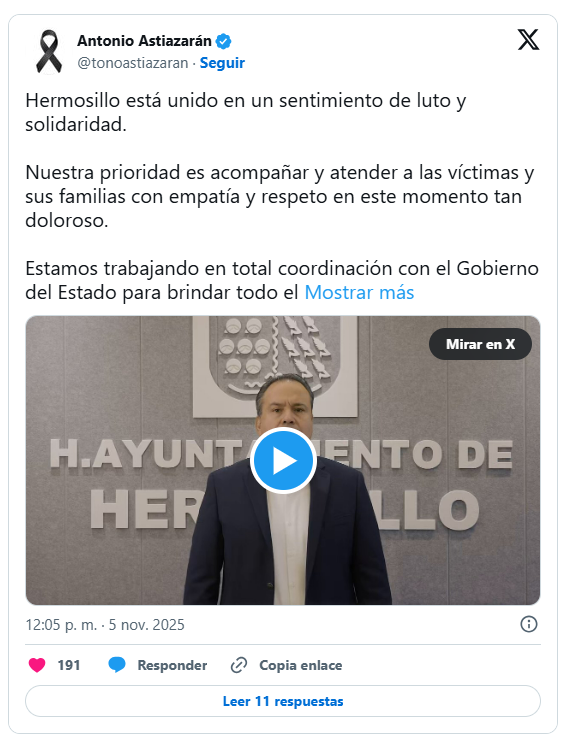 El alcalde agradeció a Bomberos de Hermosillo, policías municipales, elementos de Cruz Roja, del DIF, personal de salud y demás cuerpos de rescate, así como a ciudadanos el apoyo a las víctimas en el siniestro.