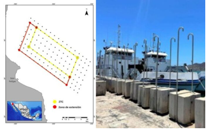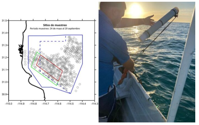 Figura 5. Mapa con los sitios de muestreo donde se colocaron con anclajes los detectores acústicos del 24 de mayo al 29 de septiembre de 2025. El polígono azul es el Refugio de Vaquita, el polígono rojo es la ZTC y el polígono verde es la AE. La imagen de la derecha muestra a un pescador lanzado un detector acústico.