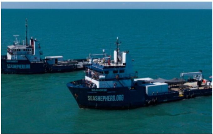 Figura 4. Las embarcaciones Seahorse y Bob Barker de la SSCS y observadores a bordo del Seahorse observando a través de los binoculares 25x. (Foto: SSCS)