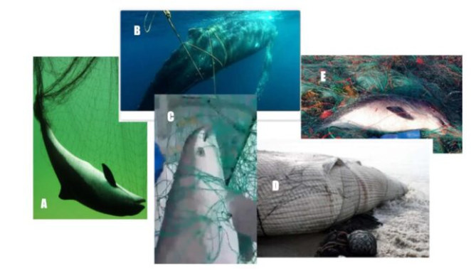 Figura 2. Cetáceos enmallados: A Marsopa común (Krzysztof Skora); B Ballena jorobada (California Ocean Alliance); C Vaquita (anónima); D Ballena de Bryde (Muhammad Moazzam WWF-Pakistán).