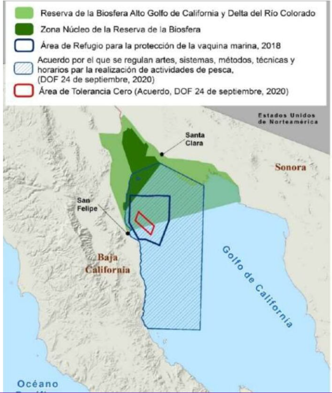 Figura 1. Polígonos de protección para vaquita y especies protegidas en el Alto Golfo de California (el Área de Extensión se muestra en la figura 3)