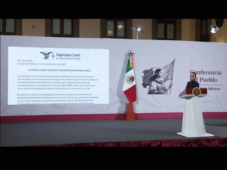 “Esto es muy importante porque no es que la Corte de pronto decide sin haber antecedentes”, dijo Sheinbaum, refiriendo al comunicado de la SCJN en donde se expone todo el proceso legal que se ha llevado, pues la empresa recurrió primero al Tribunal de Justicia Administrativa, que dio razón a la autoridad fiscal; después de ello promovieron amparos ante tribunales colegiados, que también fueron negados y finalmente llegaron a la Suprema Corte anterior, en donde quedaron congeladas las peticiones de amparo de la empresa.