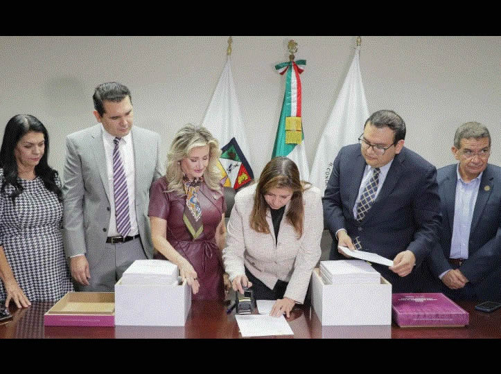La entrega de documento fue realizado la tarde de este jueves por los secretarios de Gobierno, Adolfo Salazar Razo y de Hacienda Carlos Hernández Cordero y recibido por la presidenta de la Mesa Directiva del Congreso del Estado María Eduwiges Espinoza Tapia y la presidenta de la Comisión de Hacienda, Elia Sallard Hernández.