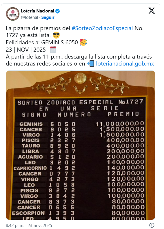 El boleto número 6050 del signo géminis fue el ganador, fue dispuesto a la venta en Ciudad Obregón, en Sonora.