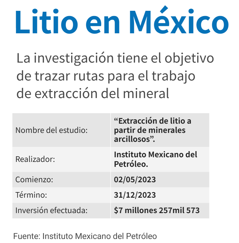 El Instituto Mexicano del Petróleo realizó un estudio desde el sexenio pasado, durante la presidencia de Andrés Manuel López Obrador, donde confirmó la viabilidad técnica de explotar los yacimientos de litio existentes en el país que se encuentran en arcillas, aunque, para alcanzar ese objetivo del Gobierno de México primero tendrá que desarrollarse un método que logre extraer el valioso mineral de esos reservorios naturales.
