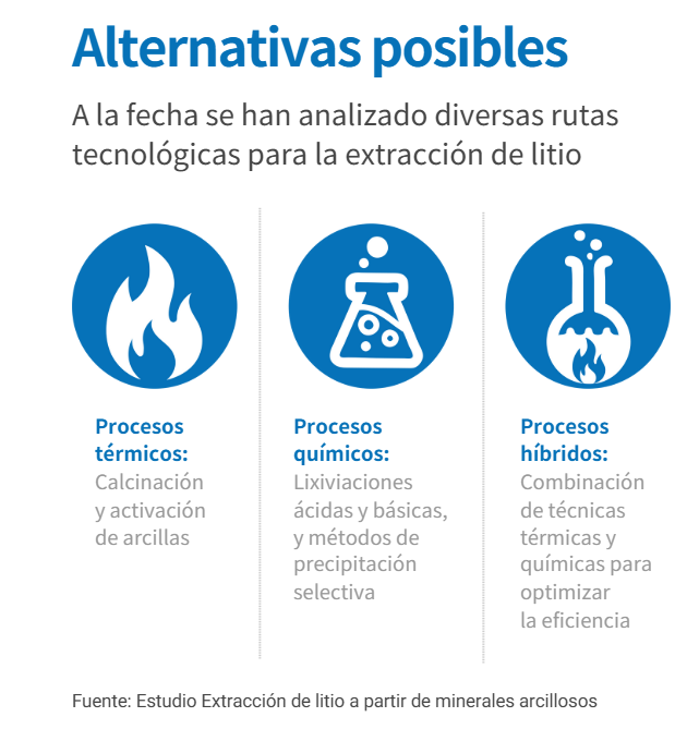 “Se analizaron diversas rutas tecnológicas para la extracción de litio: Procesos térmicos: Calcinación y activación de arcillas. Procesos químicos: Lixiviaciones ácidas y básicas, y métodos de precipitación selectiva. Procesos híbridos: Combinación de técnicas térmicas y químicas para optimizar la eficiencia. Los rendimientos, costos y eficiencias específicas han sido omitidos en esta versión pública por razones estratégicas”.