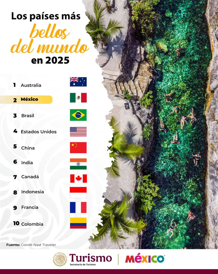 La Secretaría de Turismo (Sectur), dirigida por Josefina Rodríguez Zamora, celebró este martes que México fue reconocido como uno de los países más hermosos del mundo en 2025, ocupando el segundo lugar del ranking elaborado por la revista internacional Condé Nast Traveler.