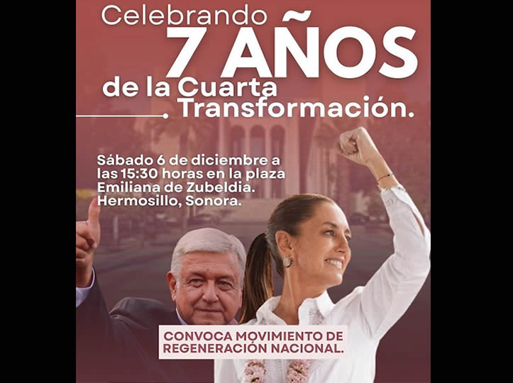 Hermosillo, Sonora.- El Movimiento de Regeneración Nacional (MORENA) Sonora, celebrará los primero 7 años de la Cuarta Transformación el próximo sábado 6 de diciembre en la Plaza Emiliana de Zubeldía.