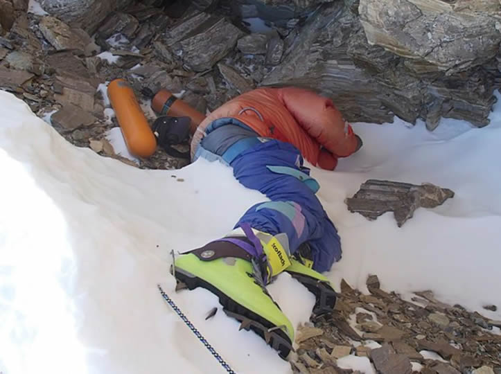 Desde 1997 yace un cadáver que parece que está saludando. Es de los primeros que pueden verse en la ascensión al Everest. Hay muchos otros cadáveres a lo largo del recorrido, algunos llevan más de 40 años allí. Y siguen en casi perfecto estado.