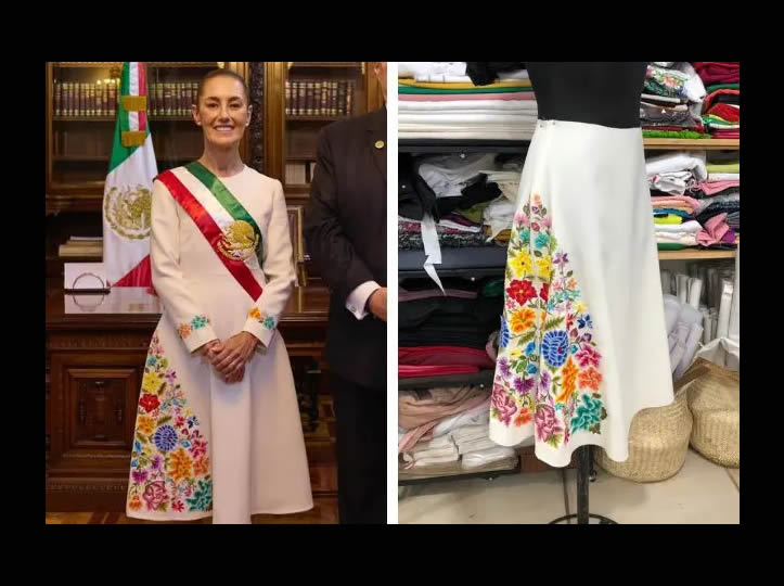 En este último, la empresa textil Lari Guie’, con sede en Oaxaca, informó que el diseño floral y el bordado estuvieron a cargo de Claudia Vasquez Aquino, mientras que el armado fue realizado por Saúl Mosqueda y la propia Trujillo, con el diseño general supervisado por el equipo de Sheinbaum.