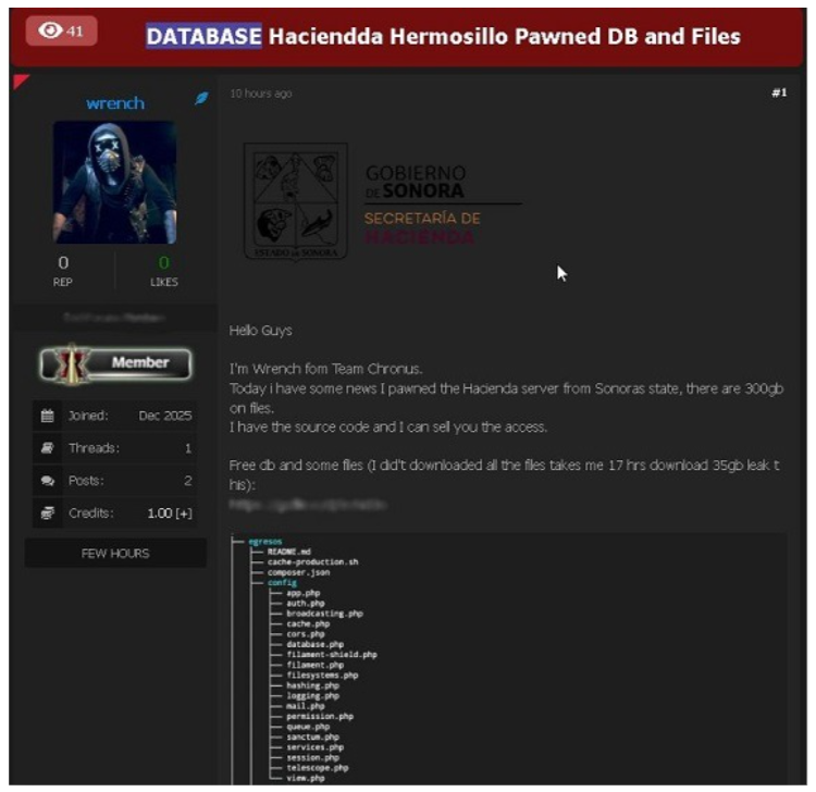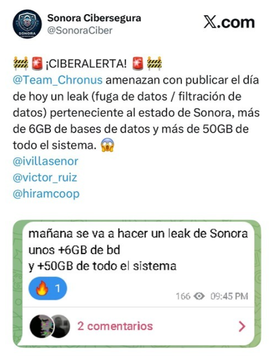 A través de la cuenta en X, Sonora cibersegura, publico el viernes 12 de diciembre que “Team_Chronus amenazan con publicar el día de hoy un leal (fuga de datos/ filtración de datos) pertenecientes al Estado de Sonora, más de 60 GB de base de datos y más de 50 GB de todo el sistema”.