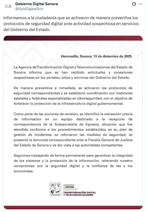 El Gobierno del Estado de Sonora informó que ante este hecho se seguirá trabajando “para garantizar la integridad de los sistemas y la protección de la información, reiterando nuestro compromiso con la seguridad digital y la confianza de las y los sonorenses”.