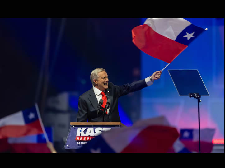 El presidente electo chileno, que ha ganado de la mano de los otros dos sectores importantes de la derecha -la histórica y la ultra del Partido Libertario-, y lo ha hecho holgadamente, como preveían las encuestas, con 17 puntos de distancia frente a Jara. Ha prometido orden y seguridad ante las principales preocupaciones de los chilenos, la delincuencia y la migración irregular.
