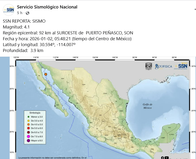 El sismo ocurrió a las 5:48 horas, a una distancia de 92 km de Puerto Peñasco y tuvo una profundidad de 3.9 km